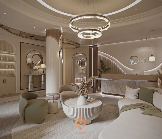 - Phòng khách nổi bật với một chiếc đèn chùm lớn, trong khi các món đồ nội thất được bọc da với sắc trắng hoặc vàng kim, thể hiện sự thanh lịch và sang trọng. Các đường nét thiết kế trên đồ đạc vô cùng tinh tế và bắt mắt. Màu sắc chủ yếu được sử dụng là trắng, vàng kim và xanh dương, tạo nên một không gian trang nhã.